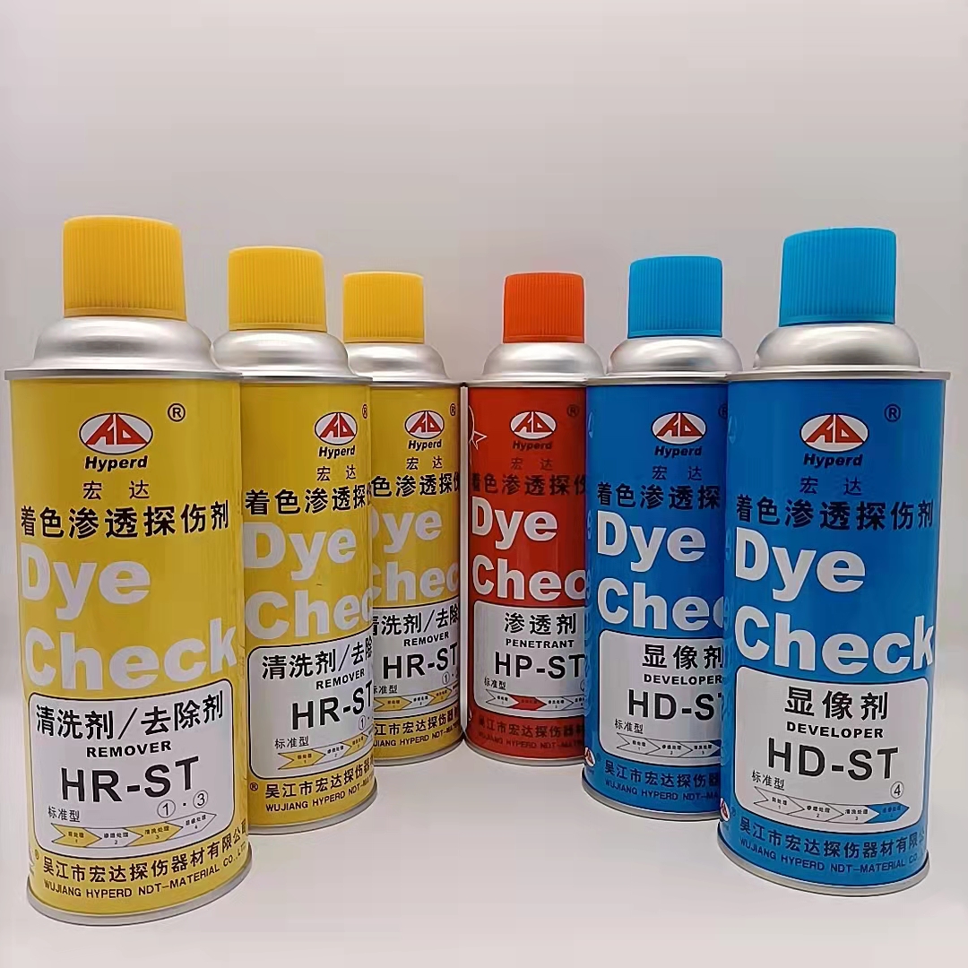 著色探傷的基本原理:用著色劑涂在材料的表面,著色劑滲入受損部位。放置一段時(shí)間后將表面的著色劑沖洗掉。在已經(jīng)清洗干凈的表面涂上顯影劑,損傷部位由于著色劑滲入其中從而看得一清二楚。主要利用毛細(xì)現(xiàn)象使?jié)B透液滲入缺陷,經(jīng)清洗劑清洗使表面滲透液清除,而缺陷中的滲透液殘留,再利用顯像劑的毛細(xì)管作用吸附出缺陷中殘留的滲透液而達(dá)到檢驗(yàn)缺陷的目的