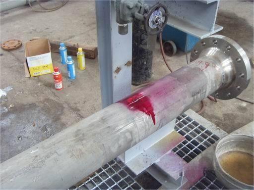 著色探傷的基本原理:用著色劑涂在材料的表面,著色劑滲入受損部位。放置一段時(shí)間后將表面的著色劑沖洗掉。在已經(jīng)清洗干凈的表面涂上顯影劑,損傷部位由于著色劑滲入其中從而看得一清二楚。 主要利用毛細(xì)現(xiàn)象使?jié)B透液滲入缺陷,經(jīng)清洗劑清洗使表面滲透液清除,而缺陷中的滲透液殘留,再利用顯像劑的毛細(xì)管作用吸附出缺陷中殘留的滲透液而達(dá)到檢驗(yàn)缺陷的目的。