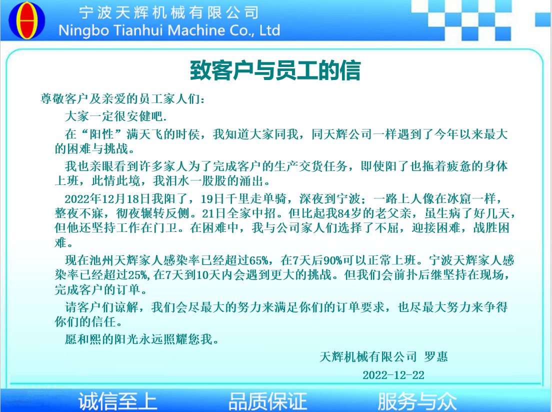 對(duì)于生產(chǎn)精密機(jī)械零件的生產(chǎn)企業(yè)來說,年底是趕貨最忙的時(shí)候。鑒于目前去全國疫情爆發(fā),天輝公司總經(jīng)理特致信給客戶和員工。對(duì)于訂單延誤,我們很抱歉,后續(xù)待員工康復(fù)返工將盡最大努力去趕生產(chǎn)進(jìn)度發(fā)貨。對(duì)于天輝的家人們的堅(jiān)持深表感謝。